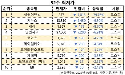 52주 최저가. [이미지=버핏연구소이어 지누스(013890, 13810원, ▼ 1450, -9.5%), 캐리(313760, 1867원, ▼ 178, -8.7%), 명인제약(317450, 97000원, ▼ 7200, -6.91%), 코아스(071950, 3825원, ▼ 190, -4.73%), 제이엘케이(322510, 5070원, ▼ 230, -4.34%), 코어라인소프트(384470, 4370원, ▼ 170, -3.74%), 제테마(216080, 5710원 ▼ 200, -3.38%), 포인트엔지니어링(256630, 1045원, ▼ 27, -2.52%), E8(418620, 2295원, ▼ 50, -2.13%) 순이다.