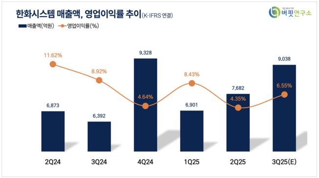 장남현 한국투자증권 애널리스트는 "한화시스템의 3분기 연결 매출액 8899억원(전년동기대비 +39.2%), 영업이익 442억원(전년동기대비 -22.5%)으로 컨센서스 592억원을 25.4% 하회할 것”으로 추정했다. 다만 “방산 부문은 수출 비중 19.8% 전망에 힘입어, 영업이익 545억원(전년동기대비 +17.7%)을 기록하며 이익 개선을 지속하고 있다”고 설명했다.