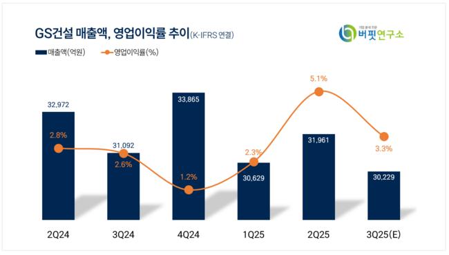 조정현 IBK투자증권 애널리스트는 GS건설의 3분기 영업실적을 매출액 3조원(전년동기대비 -3.1%), 영업이익 1214억원(전년동기대비 +48.4%)으로 추정했다. 특히 영업이익은 시장추정치(1065억원)를 상회할 것으로 전망했다. 이는 주택 건축부문에서 준공 정산 이익이 반영되고, 플랜트 매출은 기성 효과가 본격적으로 반영될 것으로 판단됐기 때문이다.