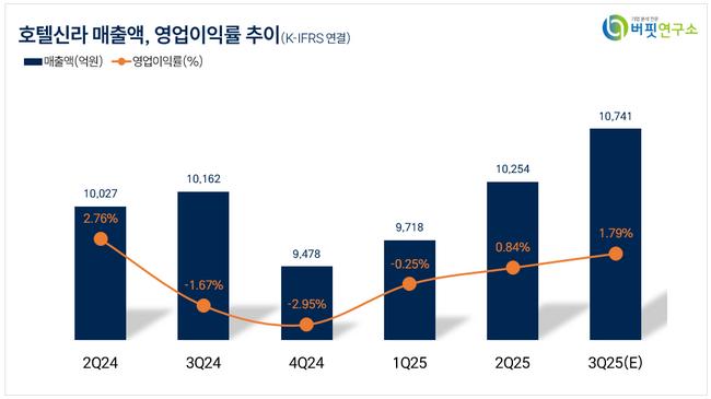 한국투자증권의 김명주 애널리스트는 “2025년 3분기 연결기준 매출은 1조779억원으로 전년동기대비 6.1% 증가했으나, 영업이익은 168억원으로 시장 기대치보다 12.8% 낮을 것으로 추정된다”며 “공항 이용객 수 증가로 임차료 부담이 확대된 가운데 면세업 회복이 더디게 진행된 점이 수익성 하락의 주 원인”이라고 설명했다.