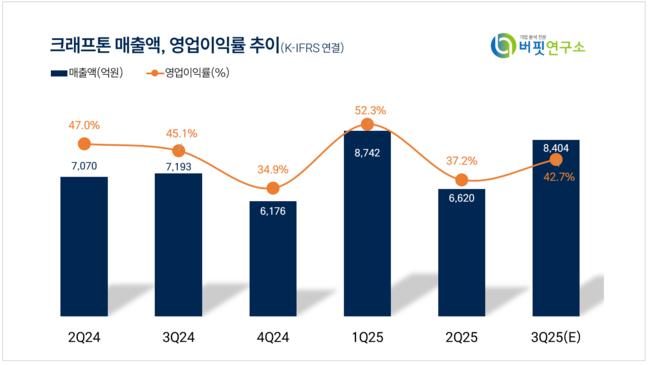 강석오 신한투자증권 연구원은 크래프톤이 3분기 영업수익 8160억원(전년동기대비 +13.4%), 영업이익 3548억원(전년동기대비 +9.4%)으로 영업이익 시장추정치 3591억원에 부합할 것으로 전망했다.