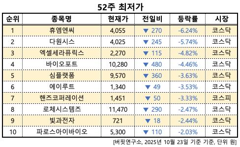 52주 최저가. [이미지=버핏연구소]이어 다원시스(068240, 4025원, ▼ 245, -5.74%), 엑셀세라퓨릭스(373110, 2270원, ▼ 115, -4.82%), 바이오포트(188040, 10280원, ▼ 480, -4.46%), 심플랫폼(444530, 9570원, ▼ 360, -3.63%), 에이루트(096690, 1340원, ▼ 49, -3.53%), 핸즈코퍼레이션(143210, 1451원, ▼ 50, -3.33%), 로체시스템즈(071280, 11470원 ▼ 290, -2.47%), 빛과전자(069540, 721원, ▼ 18, -2.44%), 파로스아이바이오(388870, 5300원, ▼ 110, -2.03%) 순이다.