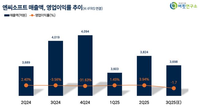 엔씨소프트의 2025년 매출액은 1조5740억 원, 영업이익은 24억 원(흑자전환), 내년 매출액은 2조1230억 원, 영업이익은 376억 원(전년동기대비 1,483.2% 증가)으로 추정됐다. 같은 해 EPS는 1만5019원, 자기자본이익률(ROE)은 10.0%로 예상됐다.