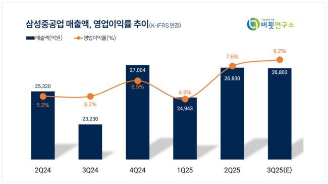 삼성중공업은 3분기 실적으로 매출액 2조6300억원(전년동기대비 +13.4%), 영업이익 2381억원(전년동기대비 +98.6%)을 기록하면서 시장추정치를 상회했다.