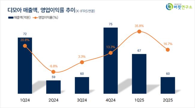 디모아는 지난 2분기 매출액 60억원, 영업이익 10억원으로 전년동기대비 매출액은 1.69% 증가, 영업이익은 14억원 증가했다(K-IFRS 연결).