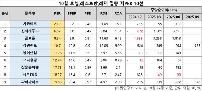 10월 호텔,레스토랑,레저주 저PER 10선. [자료=버핏연구소]