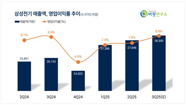 삼성전기는 3분기 매출액 2조8890억원(전년동기대비 +11.2%), 영업이익 2603억원(전년동기대비 +12.4%)으로 우호적인 환 효과에 힘입어 시장추정치를 상회하는 실적을 보였다.
