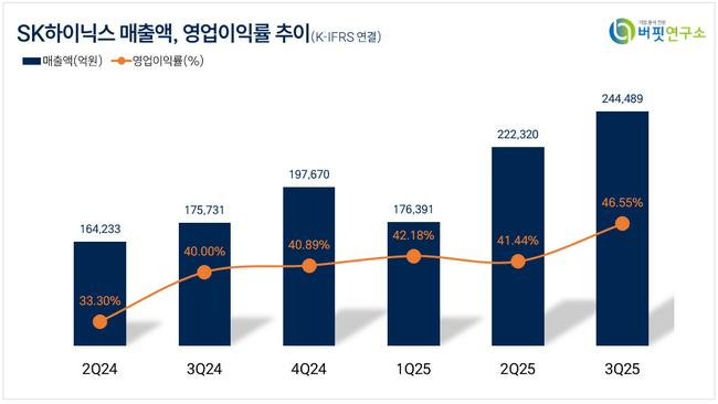 류영호 NH투자증권 애널리스트는 “3분기 매출액 24조4000억원(전년동기대비 +39.1%), 영업이익 11조4000억원(전년동기대비 +61.4%)으로 시장 기대치에 부합했다”며 “AI 서버 중심의 DRAM과 NAND 수요 강세가 이어졌고 특히 HBM 제품은 이미 2026년까지 모든 수요처와 계약을 확정지으며 실적 가시성을 확보했다”고 설명했다.
