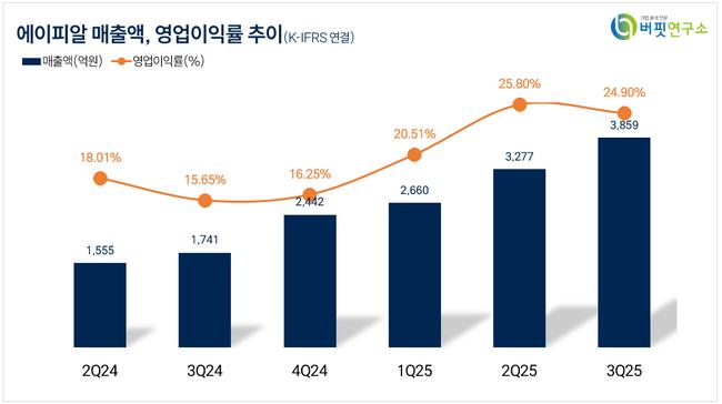 한송협 대신증권 애널리스트는 “3분기 매출 3859억원(전년동기대비 +122%), 영업이익 961억원(전년동기대비 +253%)으로 컨센서스를 크게 상회했다”며 “비수기임에도 영업이익률(OPM) 25%를 달성했고, 해외 매출 비중이 80%에 달해 글로벌 성장 체력이 강화됐다”고 설명했다.
