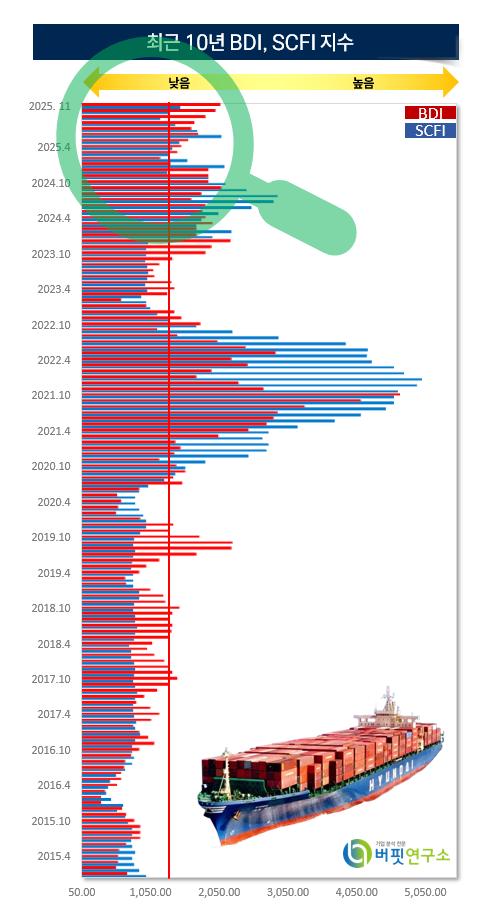 최근 10년(2015. 1~2025. 11) 사이에 BDI의 역사적 최저점은 2016년 2월 평균 336이었다. 날짜로는 2월 10일(290)이 최저였다. 이 시기 해운업은 심각한 불황을 겼었다. 같은 기간 최고점은 2021년 10월 평균 4,680이었다. 날짜로는 2021년 10월 7일(5,650)이었다. 코로나19 종료 이후 글로벌 경기 회복과 인프라 투자 증가, 중국 중심의 원자재 수요 급증하며 운임이 치솟았다.