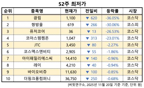 이어 쌍방울(102280, 619원, ▼ 266, -30.06%), 퓨처코어(151910, 36원, ▼ 13, -26.53%), 코아스템켐온(166480, 1047원, ▼ 313, -23.01%), JTC(950170, 3450원, ▼ 80, -2.27%), 코스맥스엔비티(222040, 2905원, ▼ 55, -1.86%), 아이패밀리에스씨(114840, 1만4410원, ▼ 140, -0.96%), 레이(228670, 4210원 ▼ 40, -0.94%), 바이오비쥬(489460, 1만1630원, ▼ 100, -0.85%), 더핑크퐁컴퍼니(403850, 3만6750원, ▼ 250, -0.68%) 순이다.