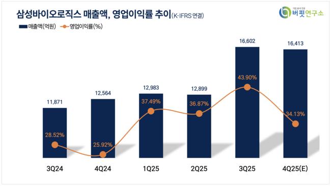 이어 “분할을 통해 삼성바이오에피스 실적이 지난 10월까지만 반영되었고 이번달부터는 제거됐다”며 “내년부터는 온전히 위탁생산 사업부문의 이익이 반영되며 4공장 풀가동에 따른 레버리지 효과 및 고환율 효과가 지속되면서 연간 40%대의 영업이익률 시현이 전망된다”고 밝혔다.