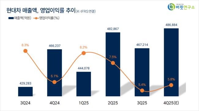 윤혁진 SK증권 애널리스트는 “내년 연결 매출액 201조7000억원(전년동기대비 +6.0%), 영업이익 13조4000억원(전년동기대비 +9.6%), 영업이익률 6.7%일 것”이라며 “내년 미국 자동차 품목 관세율 15% 기준 연간 관세비용은 4조3000억원일 것이고 관세 비용에도 양호한 실적을 기록할 수 있을 것”으로 전망했다.