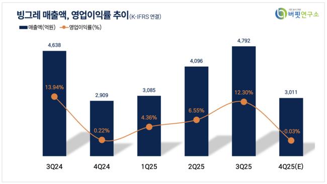 상상인증권은 25일 빙그레(005180)에 대해 3분기 연결 매출액 4792억원(전년동기대비 +3.3%), 영업이익 589억원(전년동기대비 -8.9%)으로 '아쉬운 냉장과 견조한 냉동의 온도차'가 확인됐다고 분석했다. 이에 투자의견 '매수'는 유지하되 목표주가를 기존 12만원에서 11만원으로 하향했다. 빙그레의 전일 종가는 7만3700원이다.