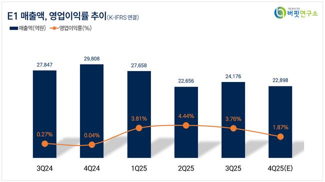 E1 매출액 및 영업이익률. [자료=버핏연구소]