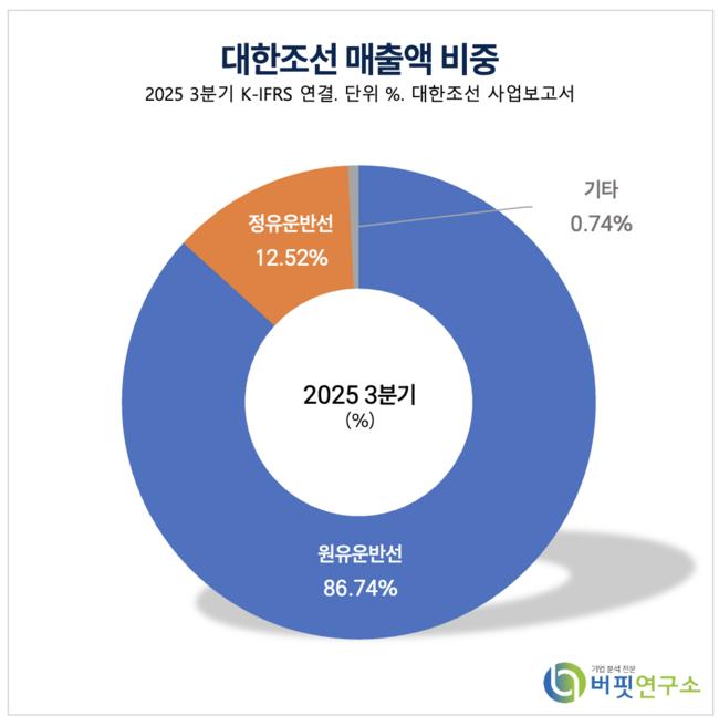 대한조선 매출액 비중. [자료=버핏연구소]그는 “향후 탱커선 시황은 원유 증산과 그림자 선단 공급 축소 영향으로 운임이 급등함에 따라 대형선 중심의 발주가 확대되는 상황이다”고 말했다.