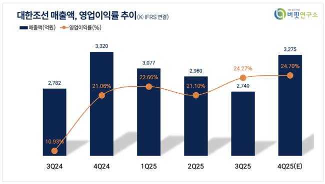 DS투자증권은 내년 대한조선 매출액 1조2950억원(전년동기대비 +7.9%), 영업이익 3310억원(전년동기대비 +19.3%), 영업이익률 25.6%로 예상했다.