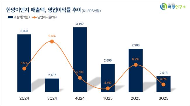 한양이엔지는 지난 3분기 매출액 2518원, 영업이익 121억원으로 전년동기대비 매출액은 1.25% 증가, 영업이익은 48.51% 감소했다(K-IFRS 연결).