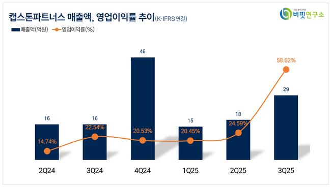 캡스톤파트너스의 2025년 3분기 영업수익은 29억원으로 전년 동기 대비 83.4% 증가했고, 영업이익은 17억원으로 381.7% 늘어났다. 회사는 지투지바이오·팀스파르타 등 투자자산 회수 증가로 고마진 구조가 강화되고 있다고 설명했다.