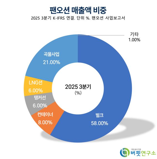 팬오션은 철광석, 석탄, 곡물 등 벌크화물을 운송하는 선사로, 브라질 철광석 기업 발레(Vale)·포스코·현대제철 등 주요 화주와 장기운송계약을 체결하고 있다. 최근 LNG 운송사업을 신성장축으로 확대하며 한국가스공사 등과 신규 계약을 추진 중이다. 회사는 2025년 3분기 기준 사선 116척을 포함해 총 258척의 선대를 운영하고 있다.