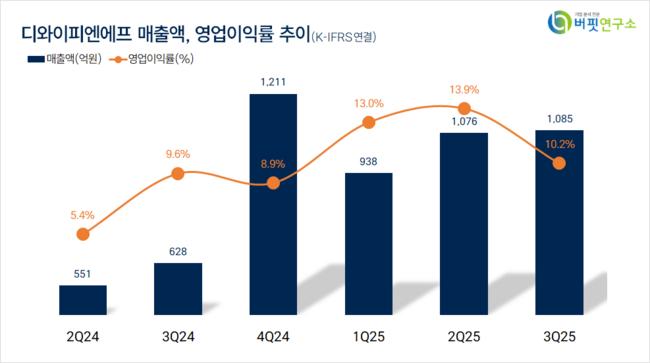 디와이피엔에프는 지난 3분기 매출액 1085원, 영업이익 111억원으로 전년동기대비 매출액은 72.77%, 영업이익은 85% 증가했다(K-IFRS 연결).