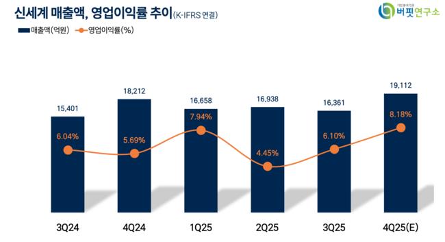신세계의 2025년 연결기준 매출액은 6조8658억원(전년동기대비 +4.5%), 영업이익은 4857억원(전년동기대비 +1.8%)으로 예상된다. 2026년에는 매출액 6조6083억원(전년동기대비 -3.8%), 영업이익 5650억원(전년동기대비 +16.3%)을 기록할 전망이다.