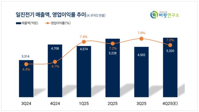 허성규 신한투자증권 애널리스트는 일진전기가 3분기 매출액과 영업이익으로 각각 4502억원(전년동기대비 +35.8%), 353억원(+140.8%)을 기록했다고 말했다. 변압기 부문은 미주 고마진 프로젝트 본격화로 이익률이 23.9%를 기록했으며, 전선 부문은 초고압 비중 확대로 7.6%를 달성했다.