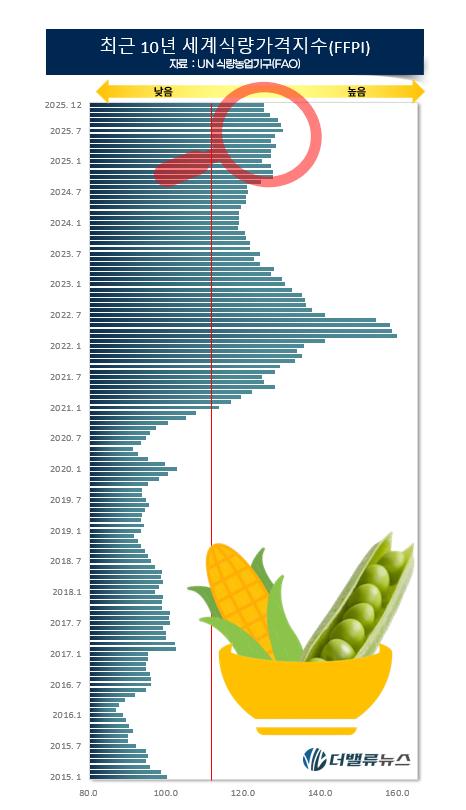 버핏연구소가 UN 식량농업기구(FAO)의 최근 10년(2015. 1~2025. 12) 세계식량가격지수(FFPI)를 조사한 결과 7월 130.1포인트로 고점을 찍은 이후 하락세로 돌아서 11월 125.1를 기록했다.