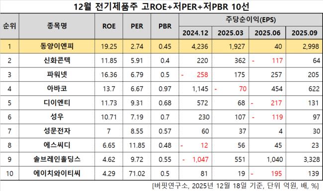 버핏연구소 조사 결과 동양이엔피가 12월 전기제품주 고ROE+저PER+저PBR 1위를 차지했으며, 신화콘텍(187270), 파워넷(037030), 아바코(083930)가 뒤를 이었다.