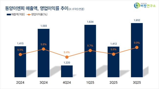 동양이엔피는 지난 3분기 매출액 1652억원, 영업이익 163억원으로 전년동기대비 매출액은 3.7%, 영업이익은 4.5% 증가했다(K-IFRS 연결).