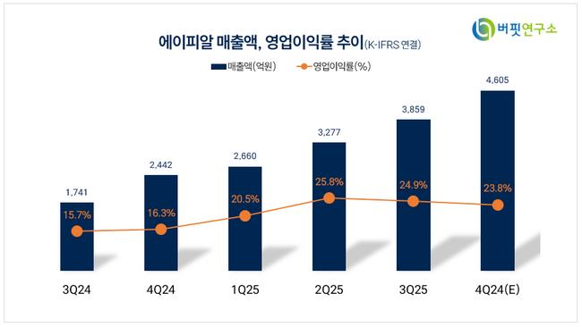 그는 “2025년 4분기 연결 매출액은 4701억원(전년동기대비 +93%), 영업이익은 1089억원(전년동기대비 +175%)으로 예상된다”며 “영업이익률은 23.2%로 고수익 구조가 유지될 것으로 전망된다”고 밝혔다.