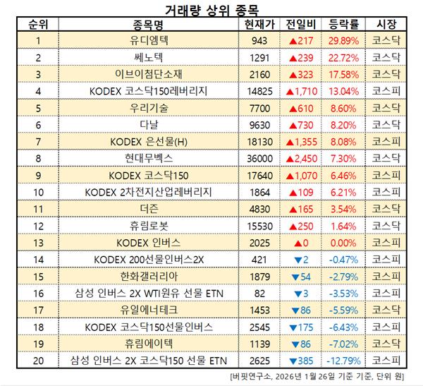 [거래량 상위 종목] 유디엠텍, 전일비 29.89% ↑... 현재가 943원