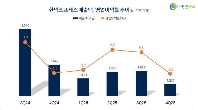한익스프레스는 4분기 매출액 1527억원, 영업손실 33억원으로 전년동기대비 매출액은 7.3% 감소, 영업손실은 1억원 축소됐다(K-IFRS 연결).